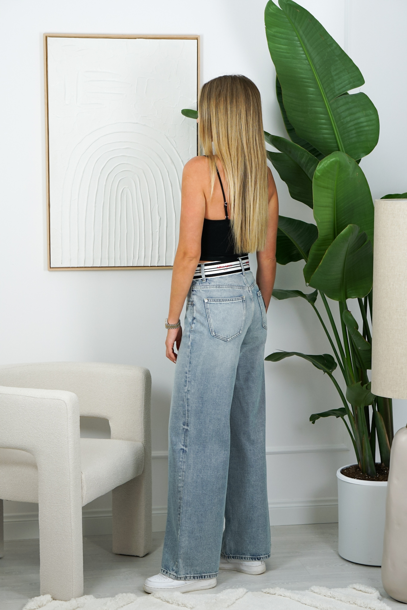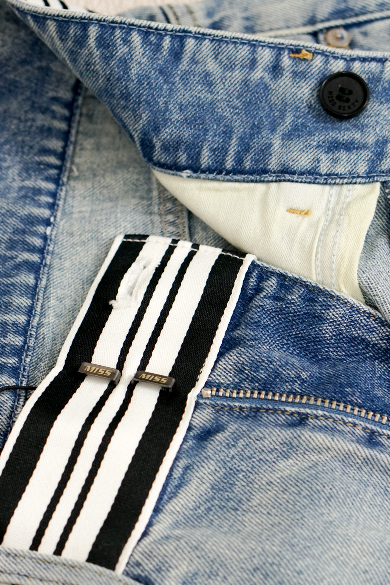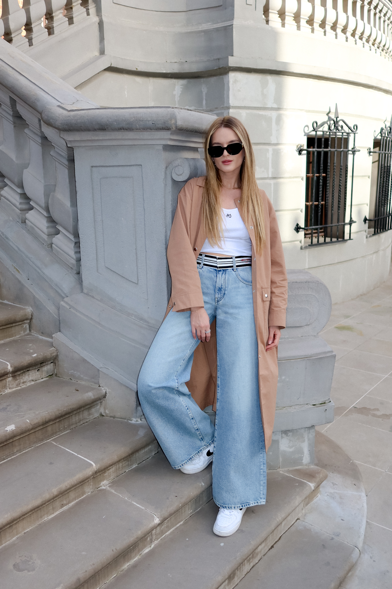 gwarantują stylowy wygląd. Tkany pasek z logowaniem marki dodaje charakteru, a wysoki stan i prosta nogawka pięknie modelują sylwetkę.